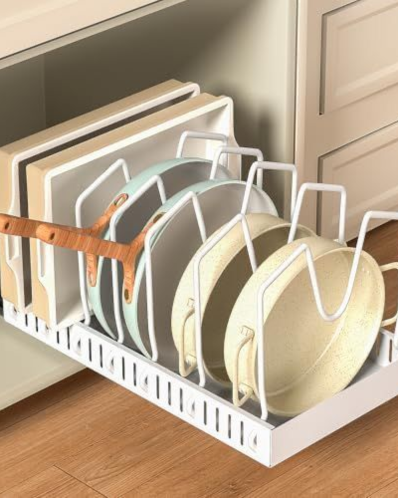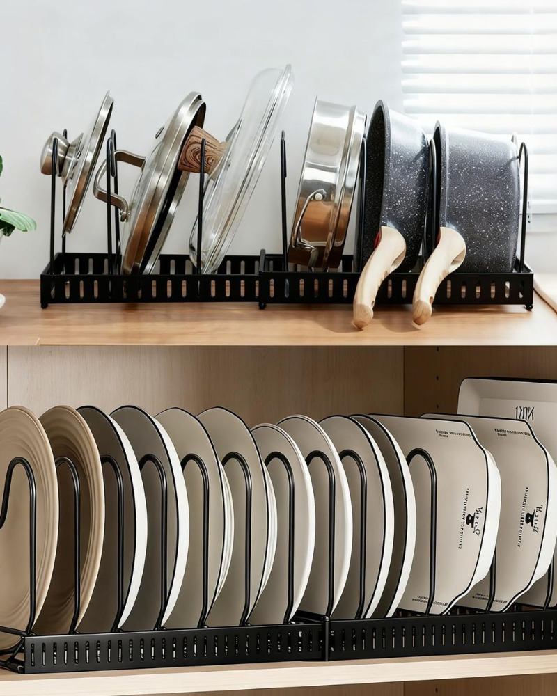 Su diseño ajustable y resistente se adapta a diferentes tamaños y tipos de utensilios, desde tapas hasta bandejas, para que cocinar vuelva a ser práctico y agradable.