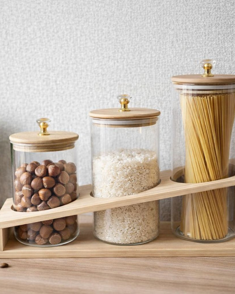 Organizador moderno y funcional ideal para mantener tu cocina ordenada y con estilo. Incluye frascos de vidrio transparentes con tapa de madera, perfectos para almacenar alimentos secos como arroz, pasta, frutos secos, azúcar y más.