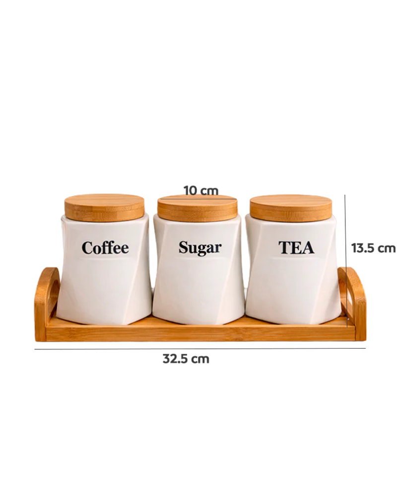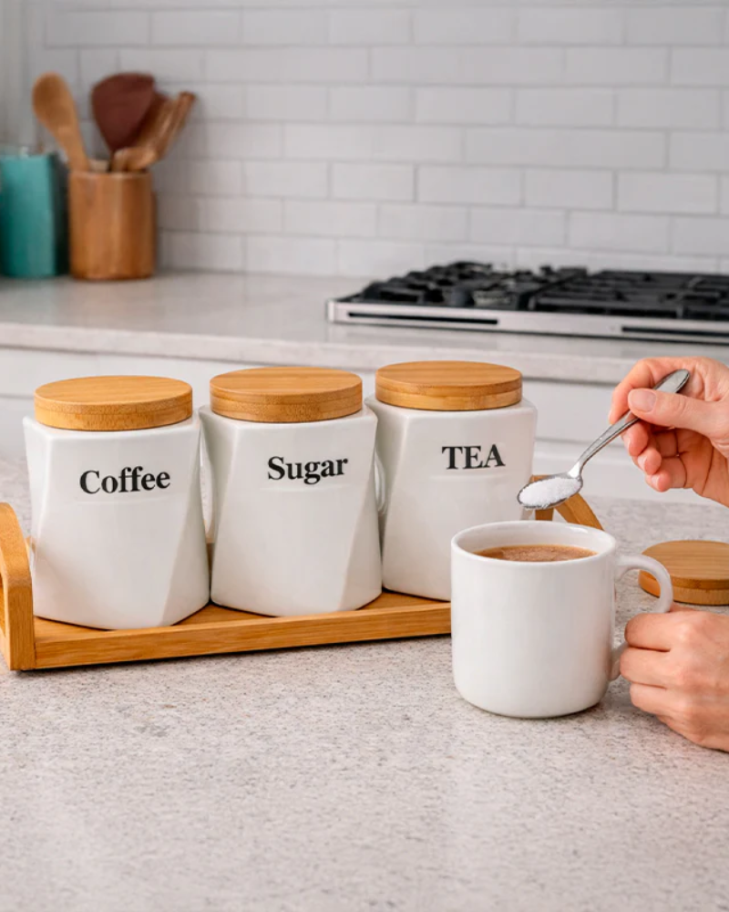 Los frascos están fabricados en cerámica blanca de alta calidad, con una forma ergonómica y elegante que facilita su uso diario. Cada uno incluye una tapa de bambú natural, ideal para mantener el contenido fresco y protegido de la humedad.